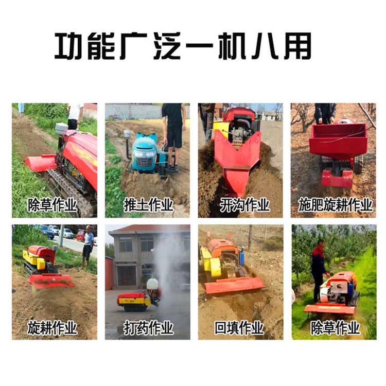 履带旋耕机适用性强:适用于各种山区,丘陵,冲积平原,旱地,温室,果园和窄小地区,省心省力。适用于各种土壤:冻土,硬土,粘土,黑土,高山可以用到柔软的土壤。履带式沟肥施肥机可以实现果园,小块耕地,温室,茶园,丘陵和山区,大型机器无法进入,等候地势和土壤质量的变化。精致,重点低履带式挖沟和回填机旋耕机杀草机。