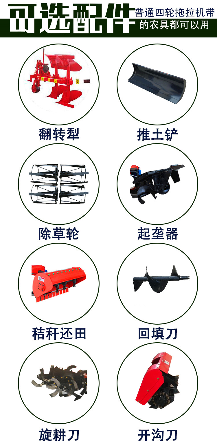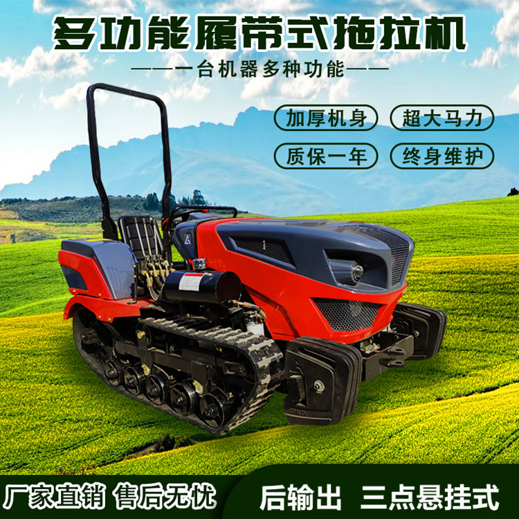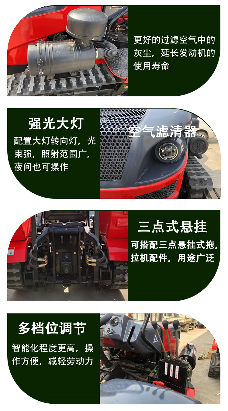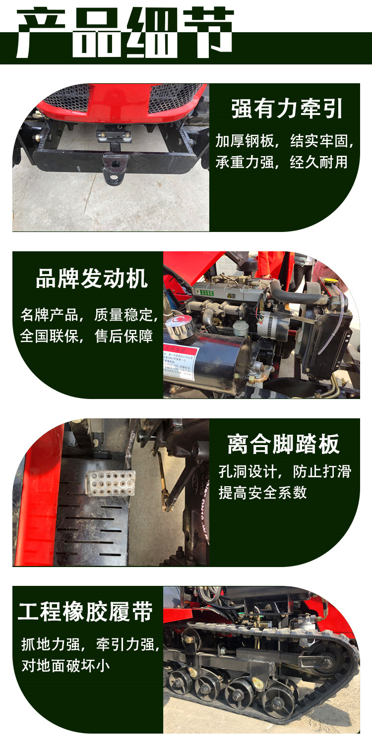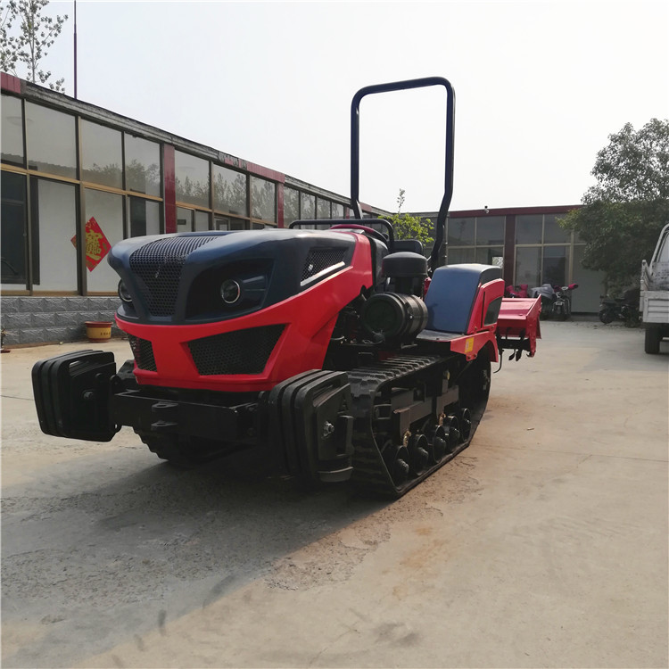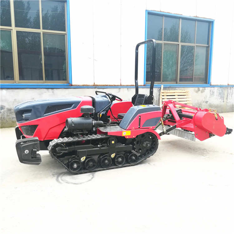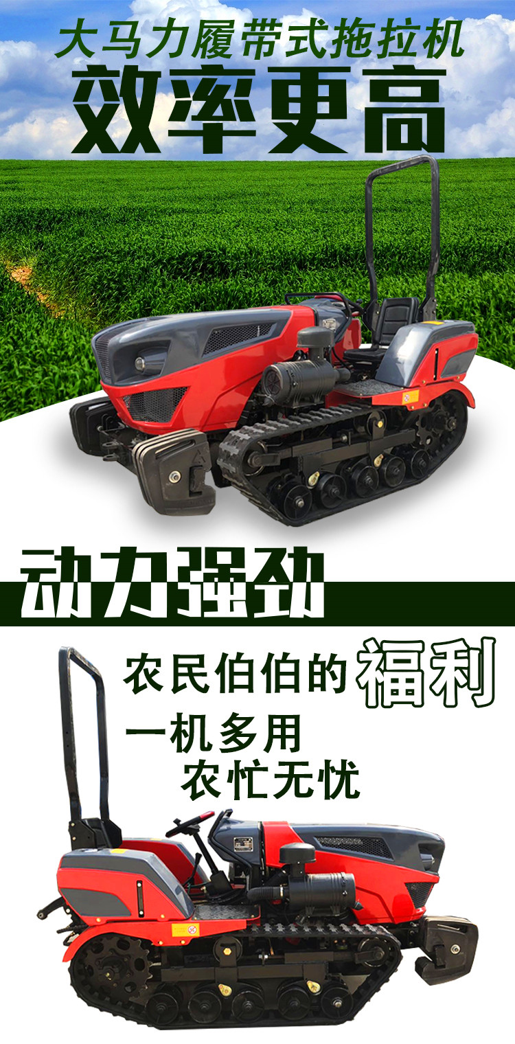 履带式拖拉机与轮式拖拉机不同,它由一圈环形轨道支撑在地面上,履带与地面触及,刺骨插入土壤中,驾驶者未接地。通过驱动扭矩,驱动轮通过驱动轮上的轮齿与履带板截面销之间的啮合从后方连续滚动履带。履带的接触地面的部分向地面强加反向力,并且相应地,履带需前反作用力pk。pk的反作用是促进拖拉机向前的驱动力。轮式拖拉机的驱动力直接传递到行走轮。与履带式拖拉机不同,其驱动力pk通过缠绕在驱动轮上的履带传递到驱动轮的轴上,然后该轴通过拖拉机的车体传递。在驱动轮上。当驱动力足以克服所携带的农具的滚动阻力和牵引阻力时,支撑轮在履带的上表面向前滚动,以便拖拉机可以向前移动。轮连续地将履带分段地向前滚动,然后通过导轮将其铺展在地面上,支撑轮可以在履带敷设的履带上连续滚动。可以看出履带式拖拉机是由履带式拖拉机实现的。履带与地面之间的相互作用通过驱动轮的驱动扭矩产生,并且驱动力大于滚动阻力和牵引阻力之和。可以装设旋耕机开沟机,@nz等工具@,杀米机等