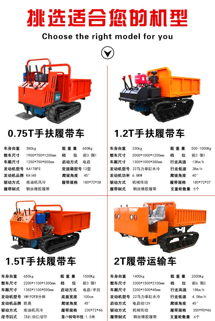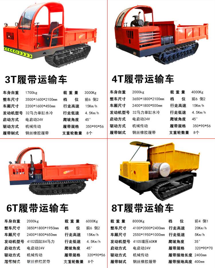 1.履带式运输自卸车可以适应复杂,恶劣的路况,例如水田,沼泽,泥泞的道路,崎mountain的山路,软草和沙漠,滑冰和雪地等。它可以在农业,林业果园,装在货场中,普遍用以水工建设,基础设施项目和采矿处所。