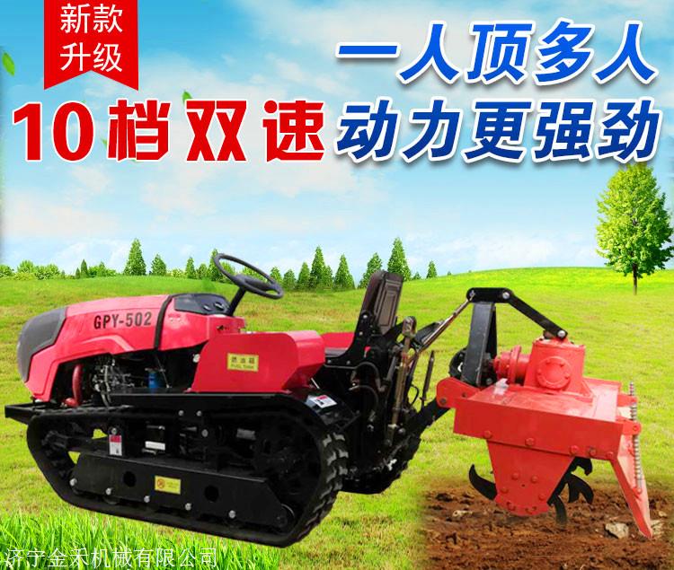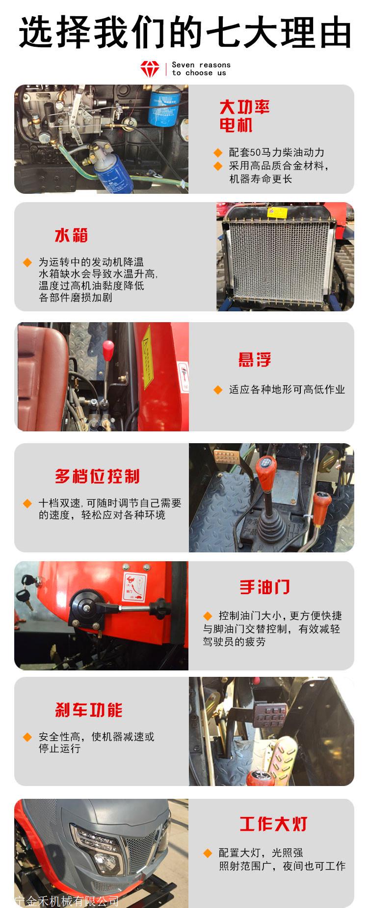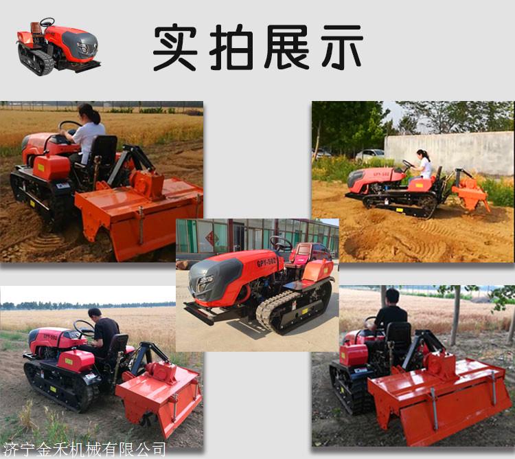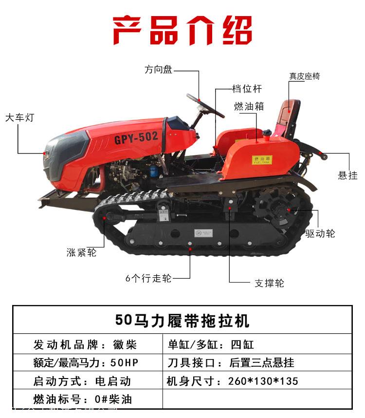 履带式拖拉机与轮式拖拉机不同,它由一圈环形轨道支撑在地面上,履带与地面触及,刺骨插入土壤中,驾驶者未接地。通过驱动扭矩,驱动轮通过驱动轮上的轮齿与履带板截面销之间的啮合从后方连续滚动履带。履带的接触地面的部分向地面强加反向力,并且相应地,履带需前反作用力pk。pk的反作用是促进拖拉机向前的驱动力。轮式拖拉机的驱动力直接传递到行走轮。与履带式拖拉机不同,其驱动力pk通过缠绕在驱动轮上的履带传递到驱动轮的轴上,然后该轴通过拖拉机的车体传递。在驱动轮上。当驱动力足以克服所携带的农具的滚动阻力和牵引阻力时,支撑轮在履带的上表面向前滚动,以便拖拉机可以向前移动。轮连续地将履带分段地向前滚动,然后通过导轮将其铺展在地面上,支撑轮可以在履带铺砌的履带上连续滚动。可以看出履带式拖拉机是由履带式拖拉机实现的。履带与地面之间的相互作用通过驱动轮的驱动扭矩产生,并且驱动力大于滚动阻力和牵引阻力之和。可以装设旋耕机开沟机,@nz等工具@,杀米机等