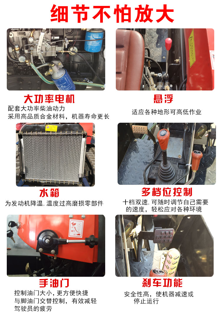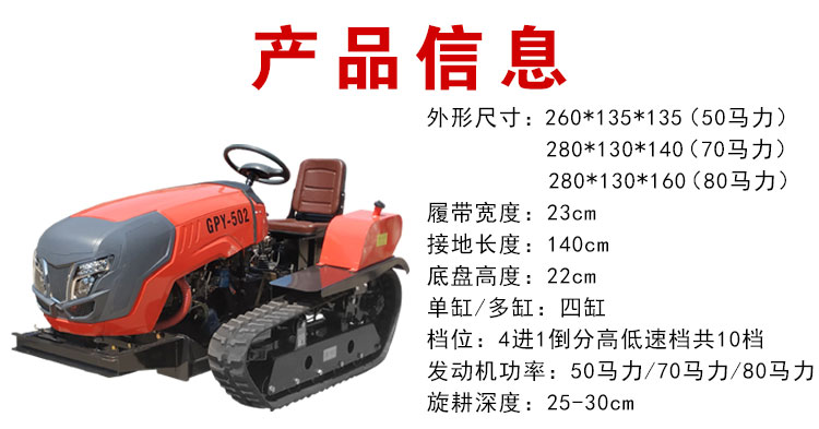 产品详情:50马力的履带拖拉机,使用履带行走:1.低接地率,以保障土壤。牵引力大,操作优势显著3。超强的通行性和爬坡能力,与轮式拖拉机相比之下使用范围更广,对土壤营养的破坏更小。选项三点悬挂连接方法,可与轮式拖拉机和农具配套用到,减低投资成本。更换工具简便,简便,功率输出大,马力大!