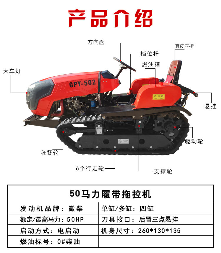 产品详情:履带式拖拉机,也称作链式履带式拖拉机,使用履带行走:1.低接地率,以维护土壤。牵引力大,操作优势显著3。超强的通行性和爬坡能力,与轮式拖拉机相比之下使用范围更广,对土壤营养的破坏更小。选取三点悬挂连接方法,可与轮式拖拉机和农具配套使用,减低投资成本。更换工具便利,简便,功率输出大,马力大!