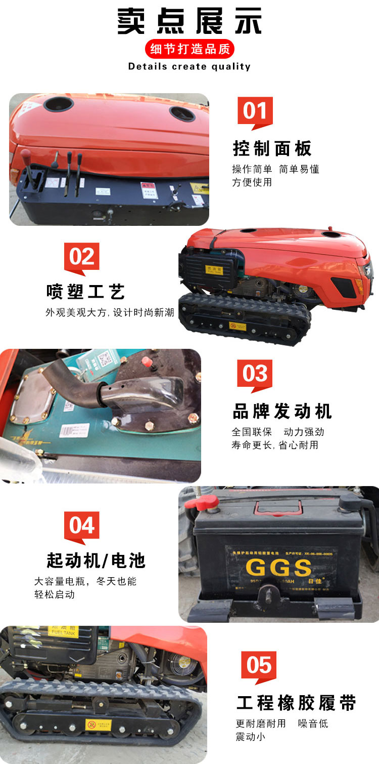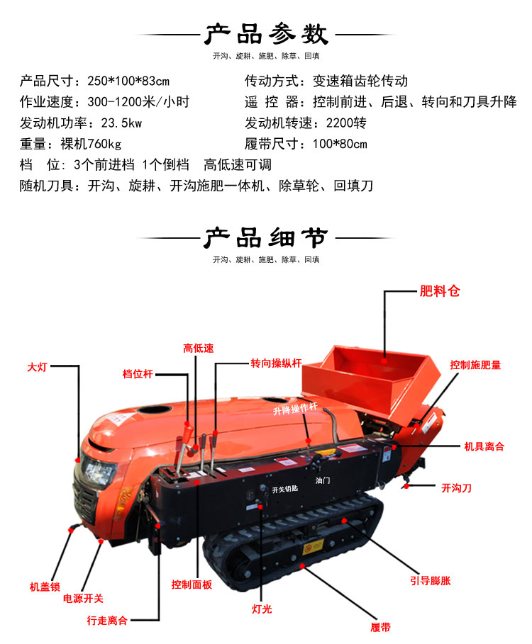 产品详情:新型履带旋耕机,升级版可根据自身的高低速度展开调整。整个机械配备有4个变速箱:走动变速箱,与变速箱相接的工具以及用以旋耕,除草和回填的变速箱。沟施肥一体机采用一个盒,工具传动是一个齿轮,又分成高速和低速。操作设备可根据泥土和山势开展选取机器构造:主机,旋耕机,开沟刀,除草轮,回填刀,开沟施肥一体机,也可以根据客户要求定制和购置其他专用农具需,例如马铃薯收割机,喷雾器,挖掘机,犁地机,回草机,旋耕和施肥机等!